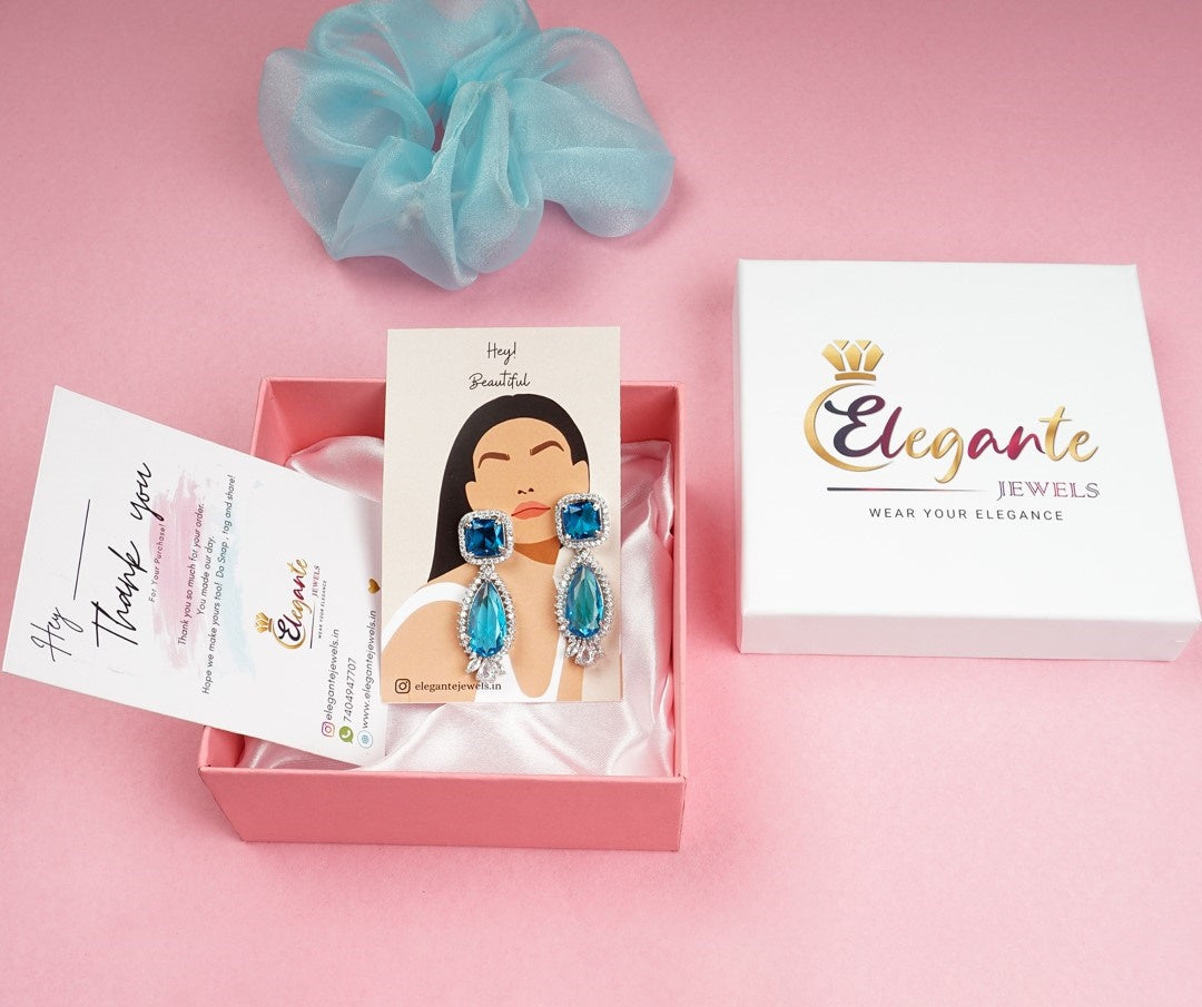 Step out in style with these Stylish and Elegant Blue and Silver Drop Earrings from Elegante Jewels! This pair is craftily designed with Blue Zircon stones that shimmer and sparkle, adding a touch of glitz to your look. The drop design and classic Silver finish will quickly become a staple in your wardrobe. These earrings' simple yet classic style will complement any outfit and make you look and feel fabulous. Show off your impeccable sense of fashion with these beautiful Blue drop earrings!