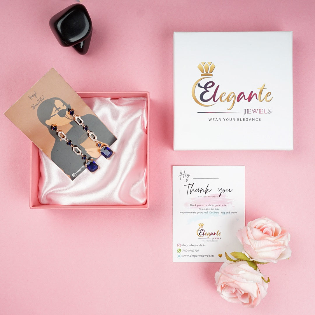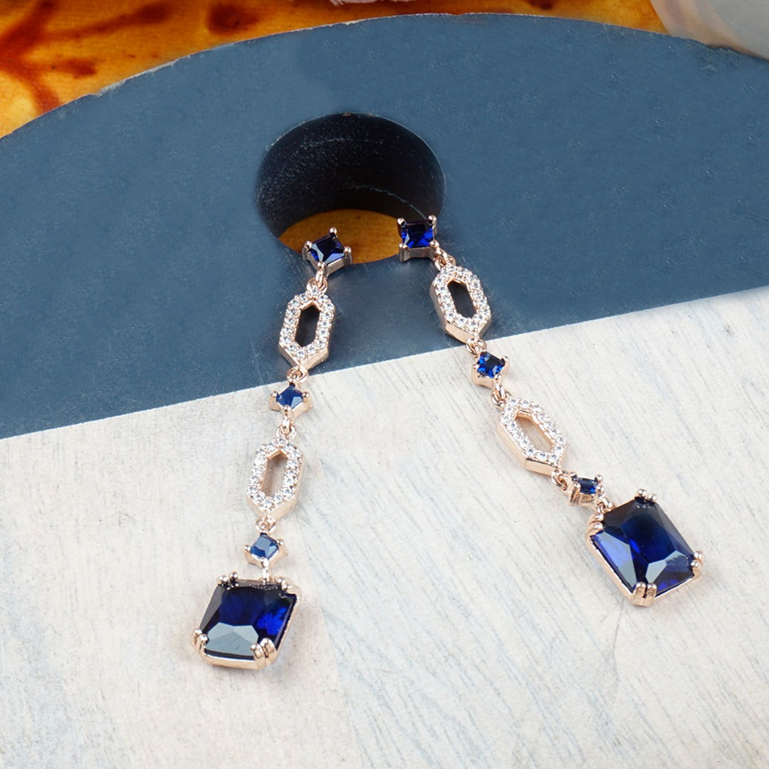 These elegant Blue Zircon stone danglers, delicately plated in rose gold, are the perfect accessory for complementing your daily modern attire.