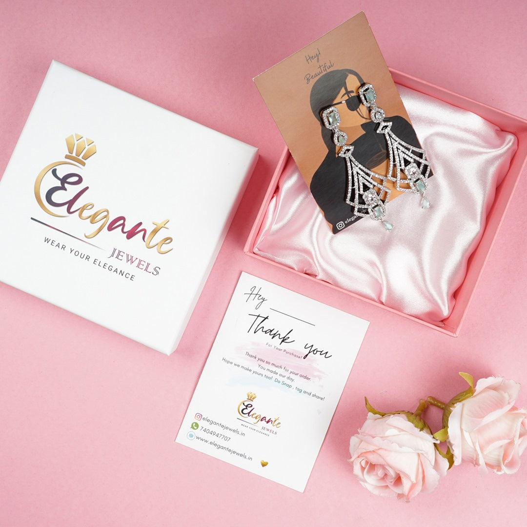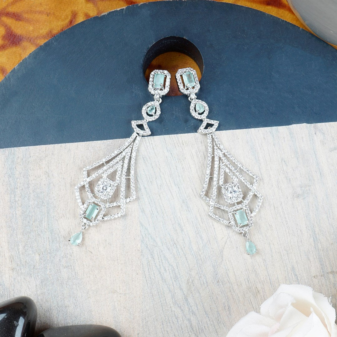 Introducing the Elegante Mint Green Silver Plated Long Diamond Earrings, the perfect accessory to elevate your style for parties, functions, and everyday wear. These stunning earrings combine timeless elegance with a modern touch, making them versatile enough to complement any outfit.