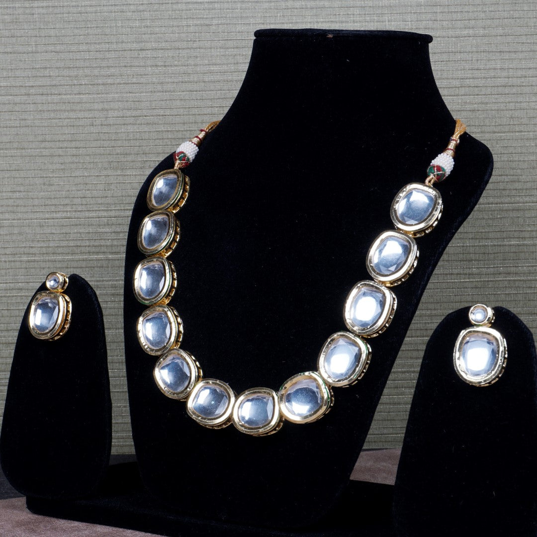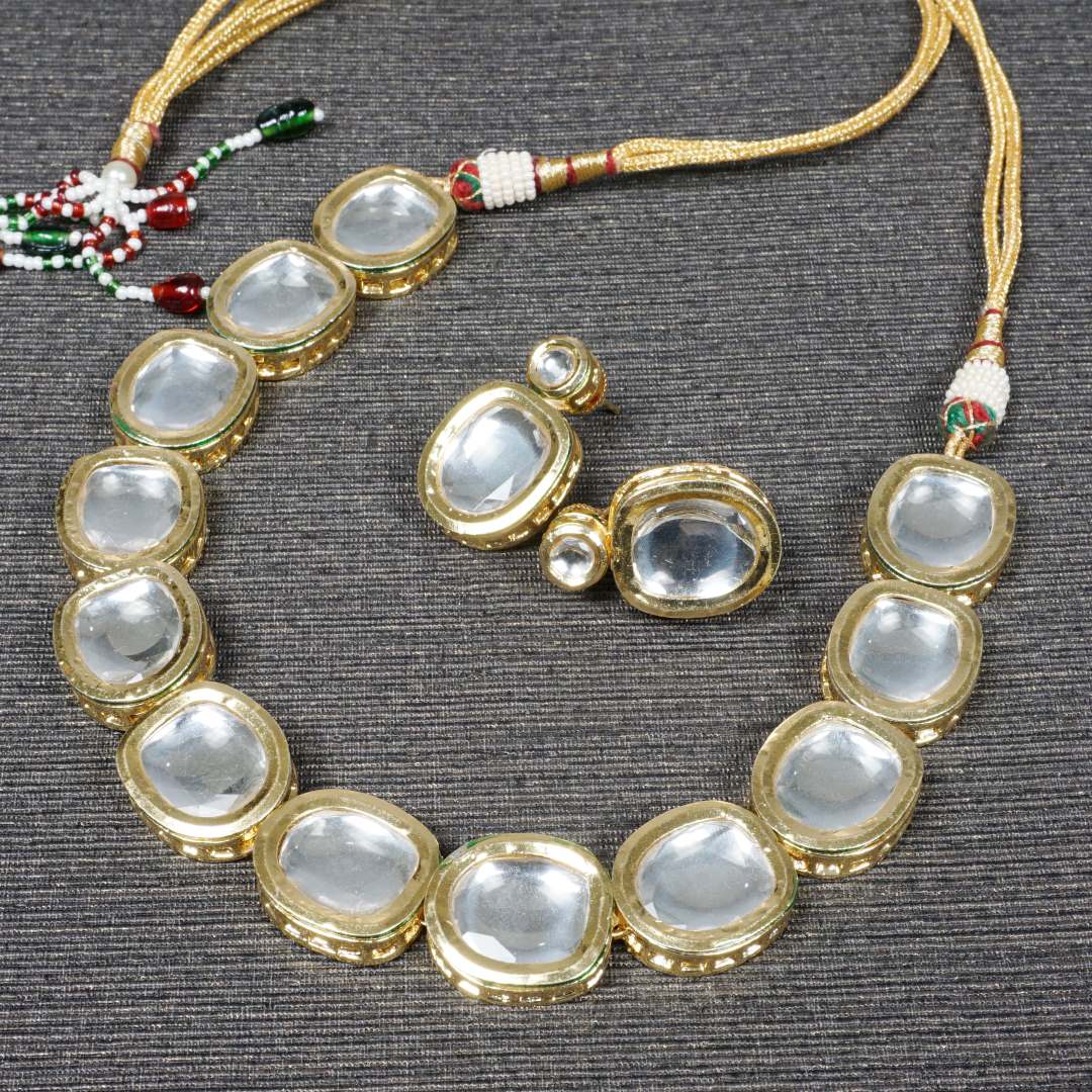 Crafted with precision, the necklace features a lustrous gold-plated finish that adds a touch of opulence. The front showcases exquisite kundan stones arranged in a captivating pattern, radiating a regal charm. The back of the necklace is adorned with delicate meenakari work, ensuring a smooth and comfortable fit against your skin.