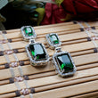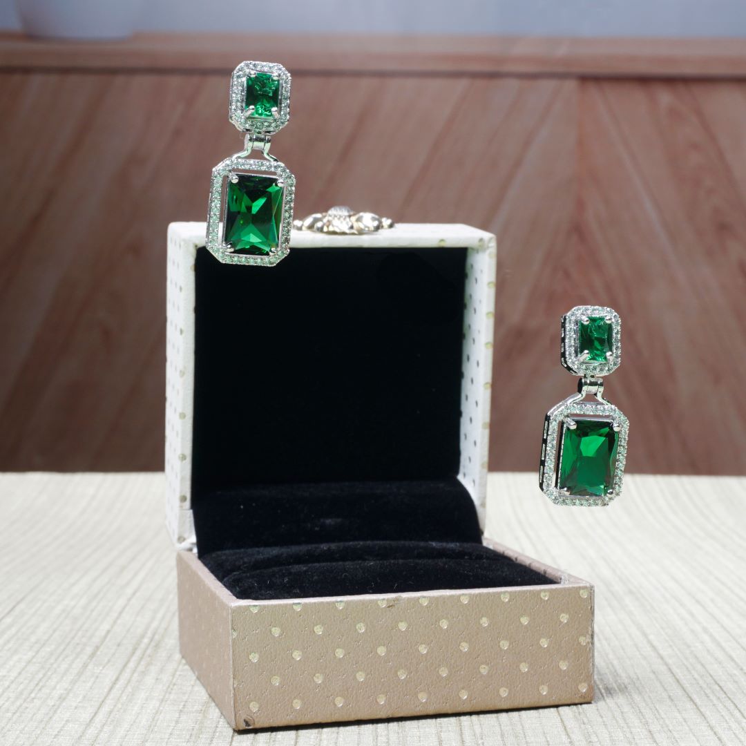 These iconic Green Diamond Earrings are the perfect everyday accessory. The beautifully crafted finish of this Green Diamond stone in the middle bracket and silver stones adds a unique character element. Their classic look will surely be an essential part of your look paired with micro Silver Diamond Stones on the outside.