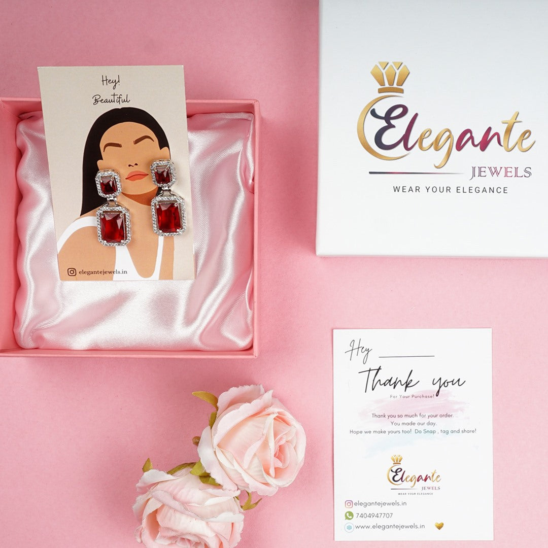 These Iconic Red Diamond Earrings are the perfect everyday accessory. The beautifully crafted finish of this Red Diamond stone in the middle bracket and silver stones adds a unique character element. Their classic look will surely be an essential part of your look paired with micro Silver Diamond Stones on the outside.