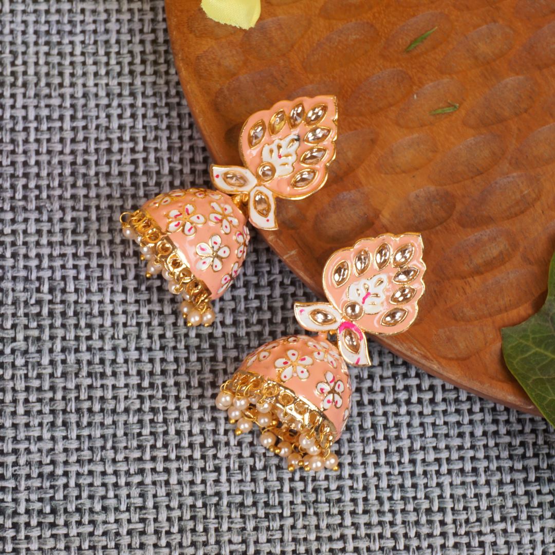 The pink jhumka, crafted with exquisite gold plating, is a charming and versatile accessory that complements various occasions with ease. Its elegant design and soft pink hue make it a perfect choice for every day wear, adding a touch of sophistication to any outfit.