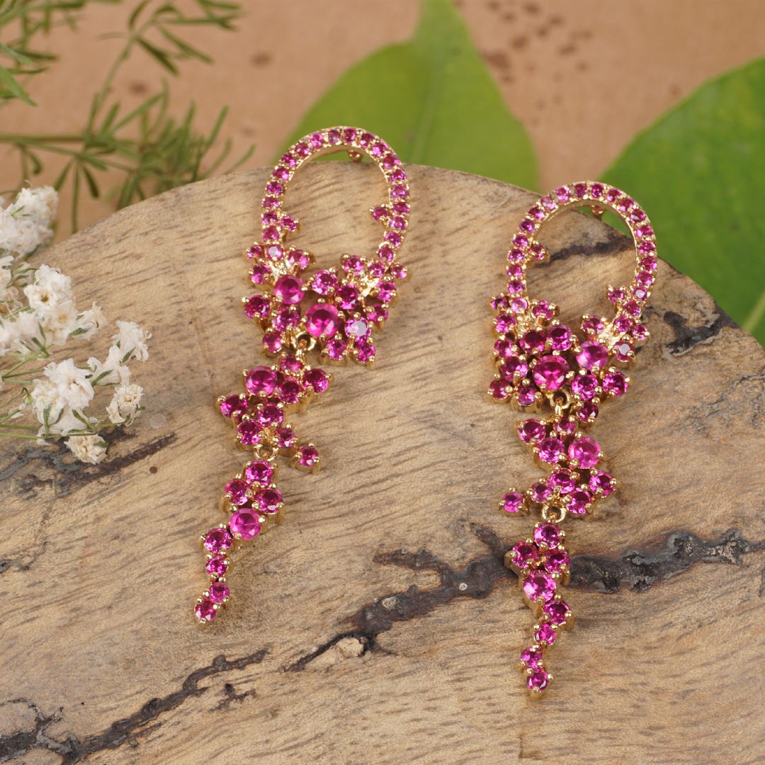 The design of these earrings allows them to gracefully dangle, catching the light and drawing attention to your face, enhancing your natural beauty. They can be paired flawlessly with white attire, accentuating the vibrancy of the rubies, or even with denim for a chic and trendy ensemble.