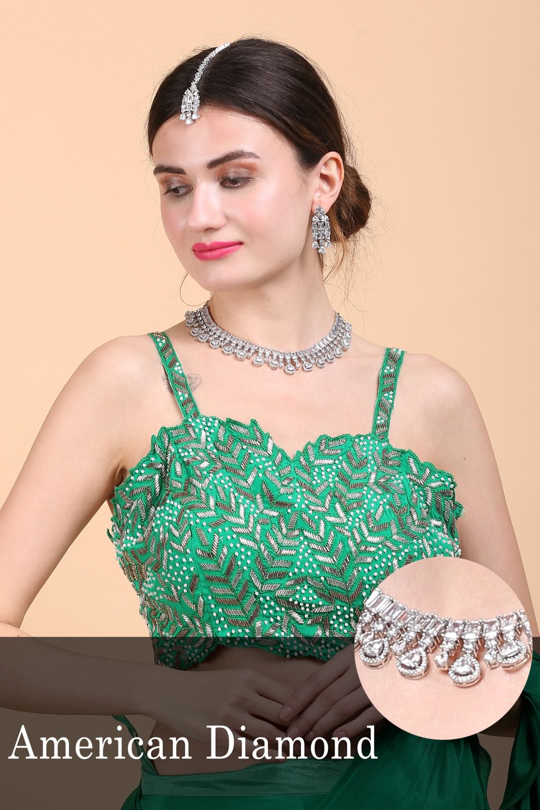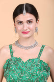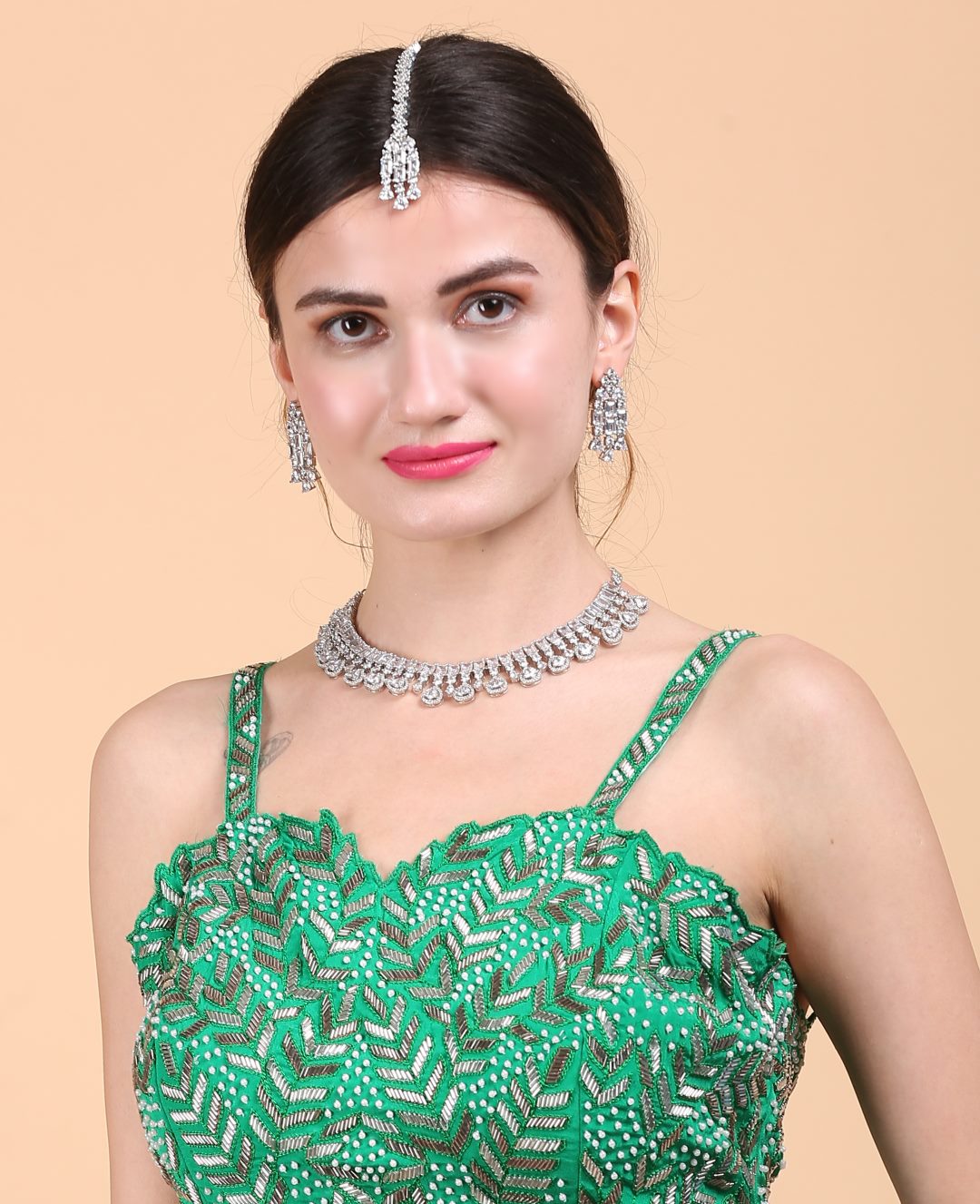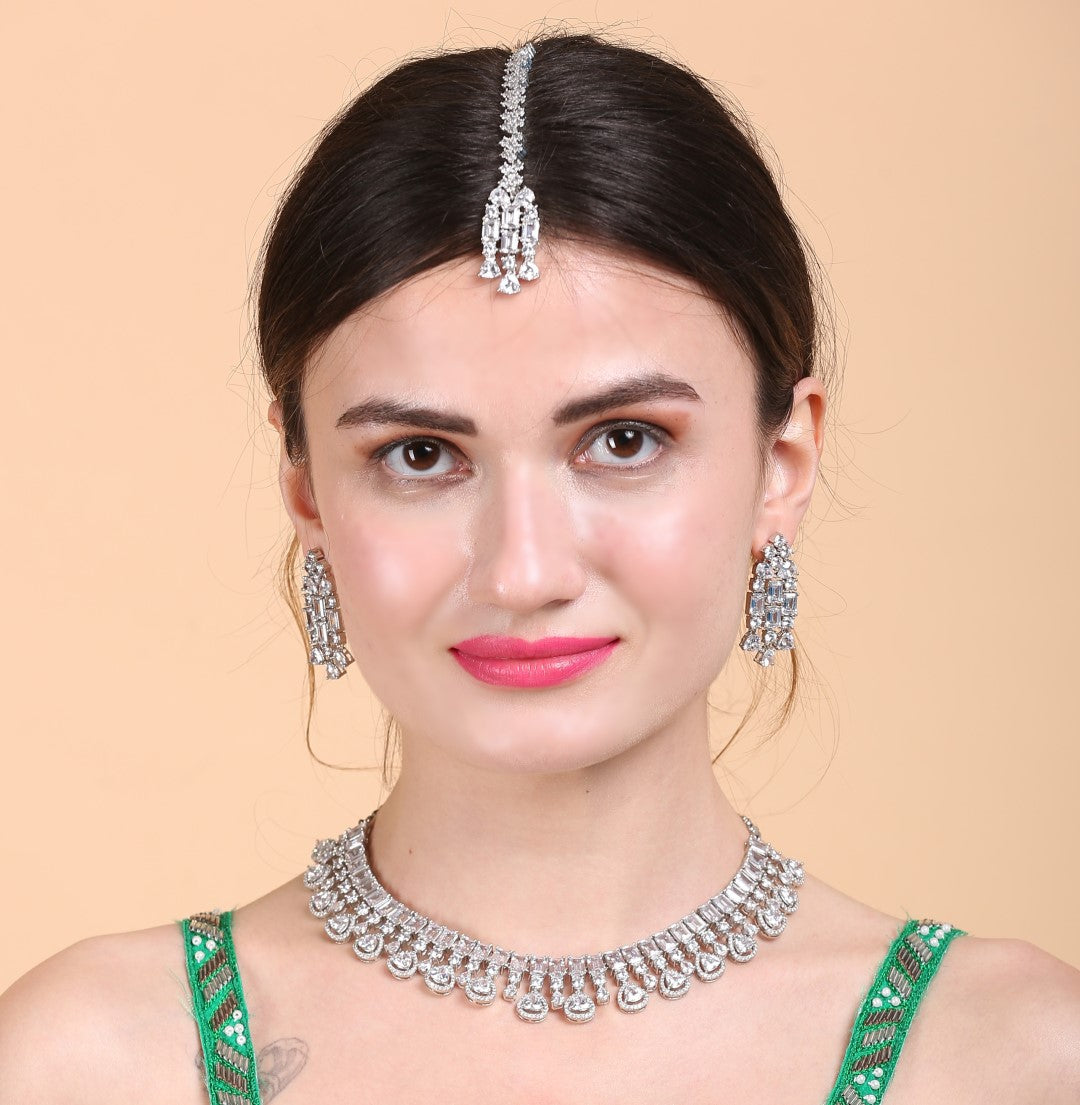 This Shimmering Silver plated Diamond Necklace Set with Mang TIkka is perfect for Weddings and Receptions. The Sleek and Flexible Diamond Crystals have a neutral color that goes with every attire, making it ideal for both modern and ethnic dresses. The beautiful Necklace adds Elegance and charm to any look and is sure to bring a smile to the face of the lucky recipient. With its delicate design and Stunning Sparkle, this exquisite set is sure to become a treasured keepsake.
